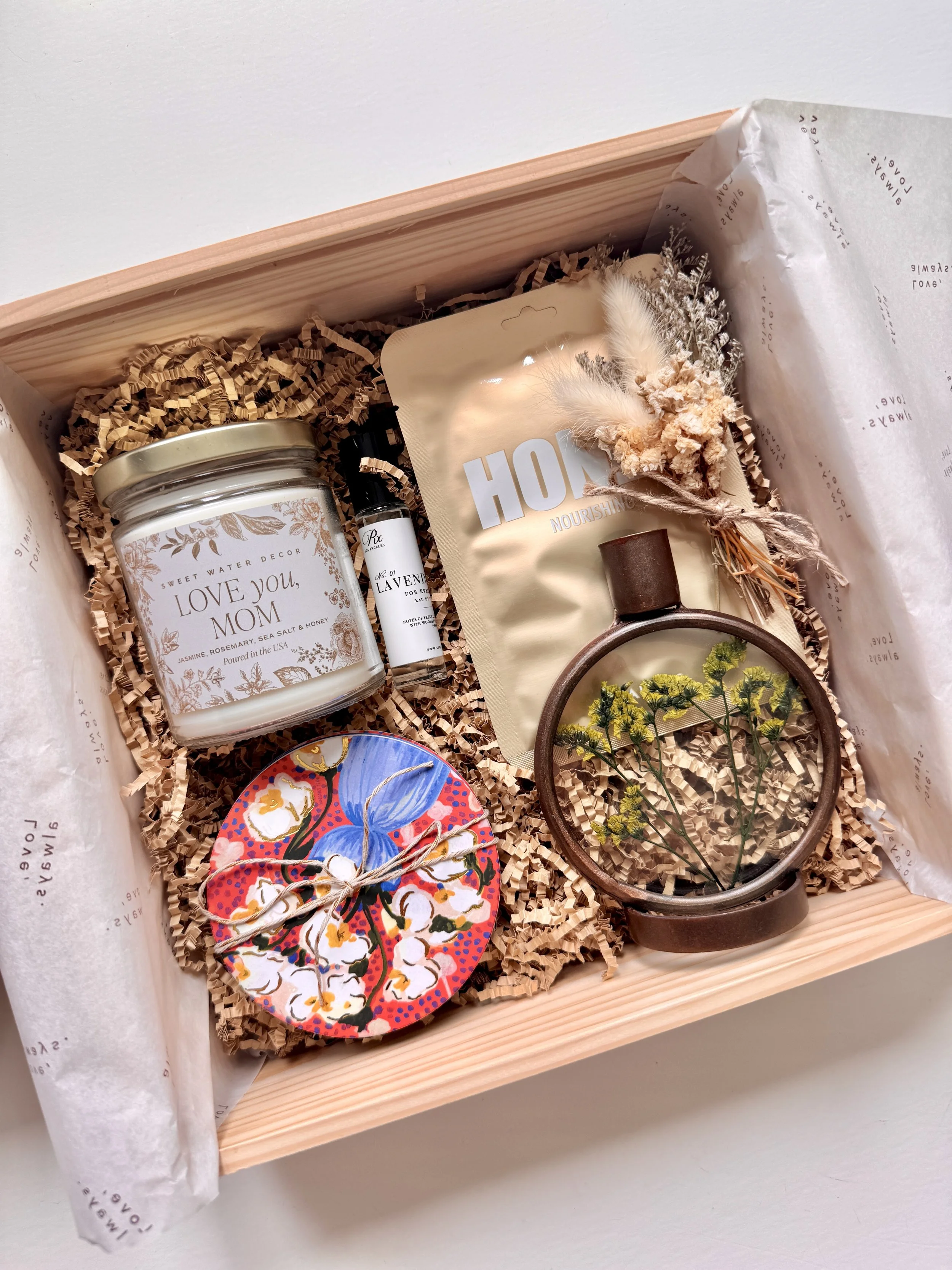 A thoughtful gift to celebrate the love, warmth, and care that mothers bring into our lives. This beautifully curated Mother’s Day gift box combines relaxing self-care essentials and heartfelt touches — elegantly packaged and ready to ship across the USA. Perfect for showing appreciation and making Mom feel truly special on her day.